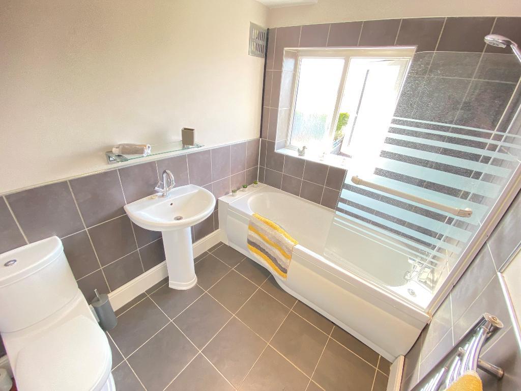 5' 10'' x 8' 2'' (1.8m x 2.5m) Double glazed window to rear elevation. Suite comprising panelled bathtub with overhead shower and shower screen. Pedestal wash hand and low level W/C. Heated towel rail along with vinyl flooring.