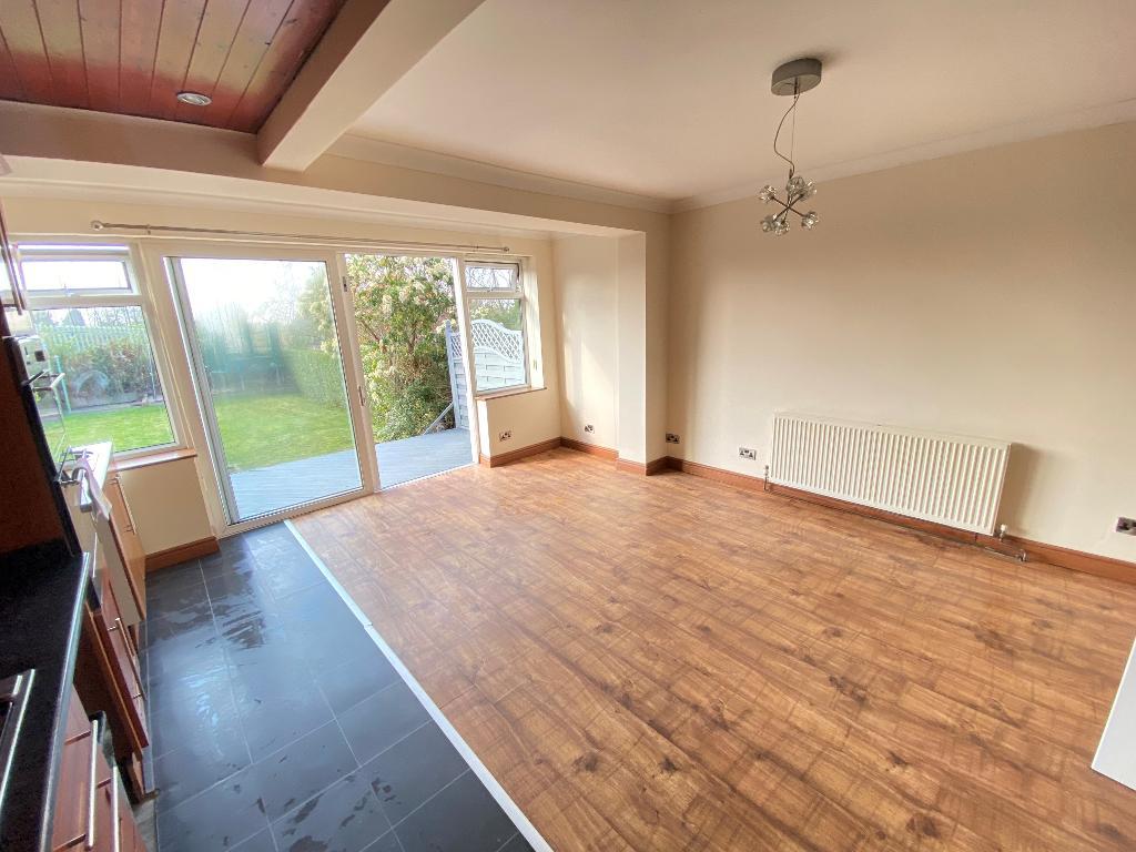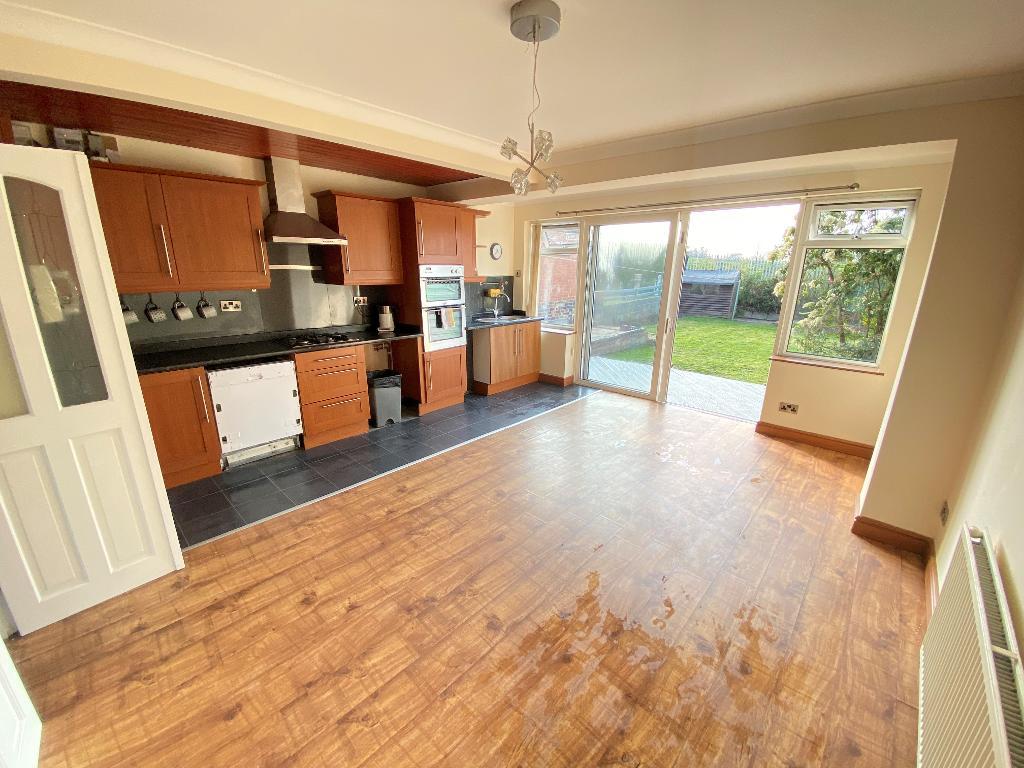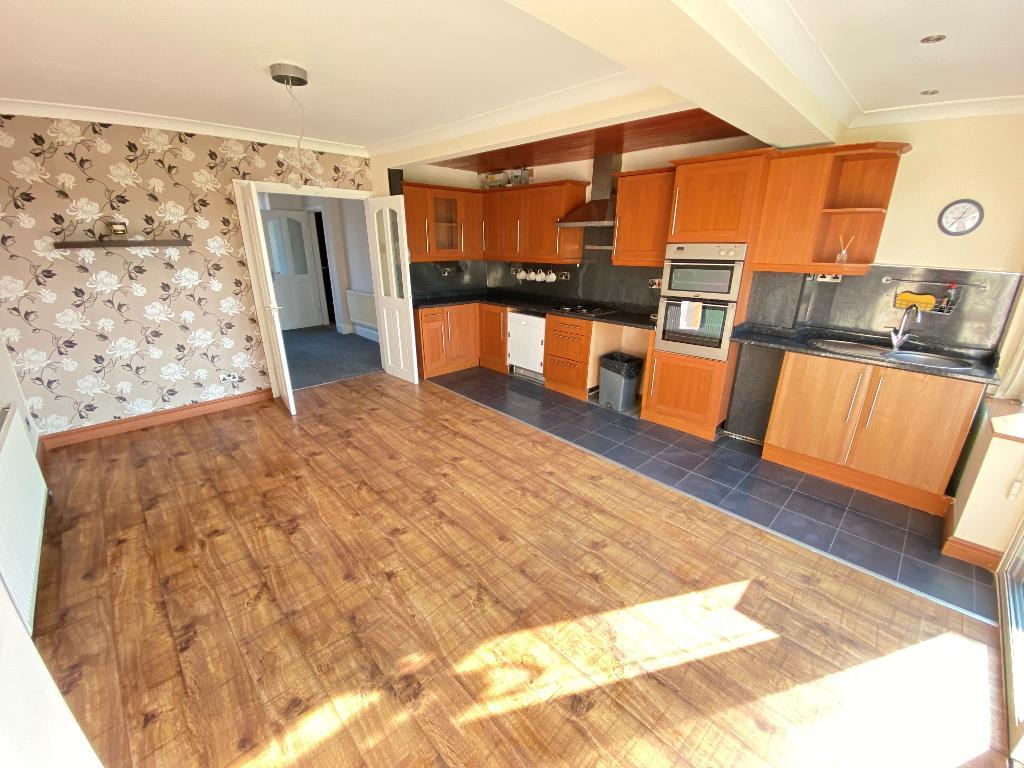 15' 1'' x 16' 0'' (4.6m x 4.9m) Two double glazed windows to rear elevation. Sliding patio doors to rear elevation. A range of wall and matching base units including storage drawers. Roll top work surfaces incorporating sink and drainer with mixer tap. Four burner gas hob with separate elevated double oven and overhead extractor fan. Laminated flooring, power points and wall mounted radiator.