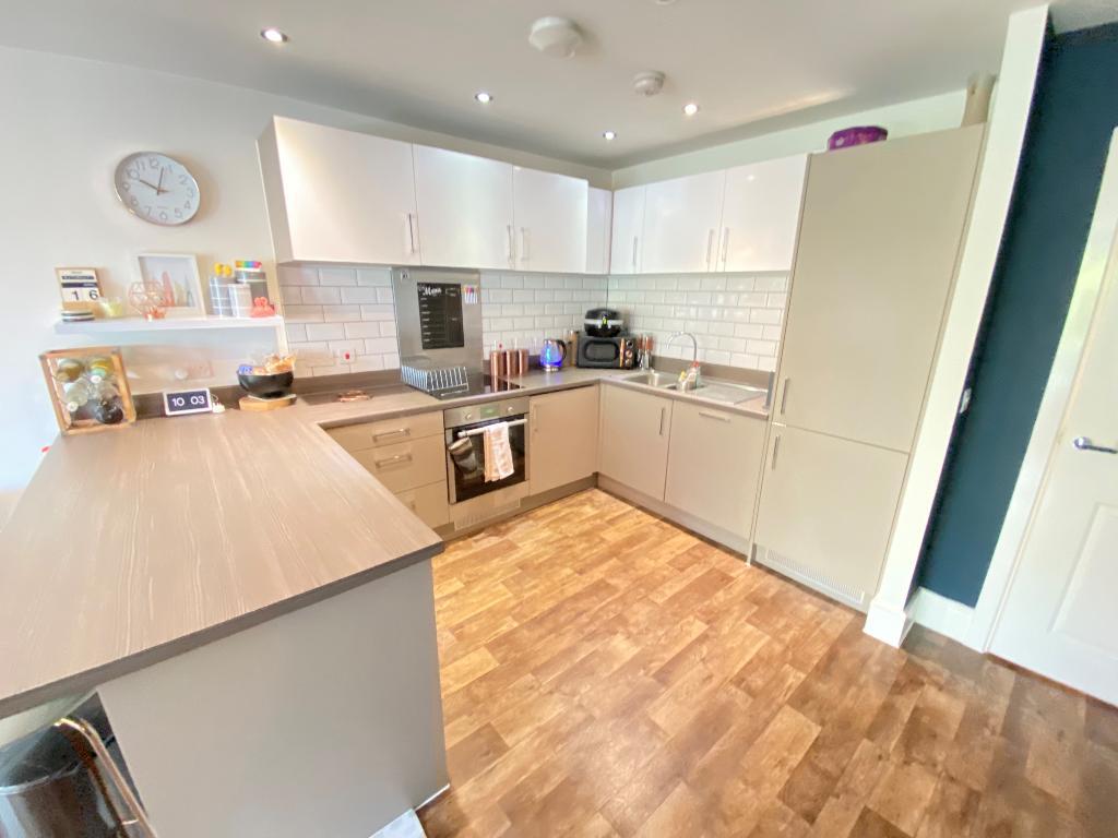 Roll top work surface with a range of matching wall and base units including storage draws. Sink and drainer with a mixer tap and tiled splash backs. Integrated electric oven, hob and extractor fan, Fridge freezer, dishwasher and a washing/drying machine. Laminate flooring with spot lighting and power points.