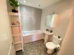 8' 2'' x 6' 2'' (2.5m x 1.9m) Pedestal wash hand basin with a mixer tap. Panel bathtub with a shower attachment and low level w/c. Part tiles walls with vinyl flooring, spot lighting and a heated towel radiator.