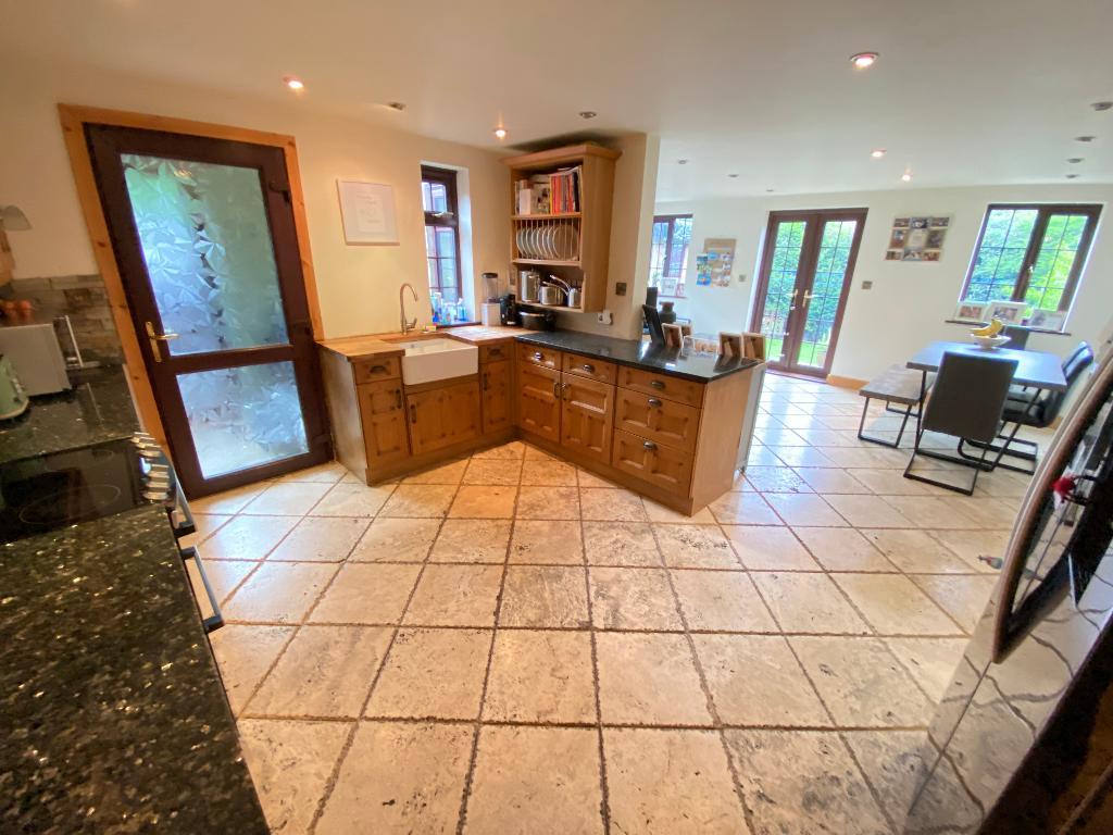 19' 4'' x 22' 11'' (5.9m x 7m) Double glazed windows to front and side elevations. French doors to rear elevation. Granite work surfaces with a Belfast sink. A range of matching wall and base units. Spot lighting. Extractor fan. Tiled flooring, power points and three wall mounted radiators.