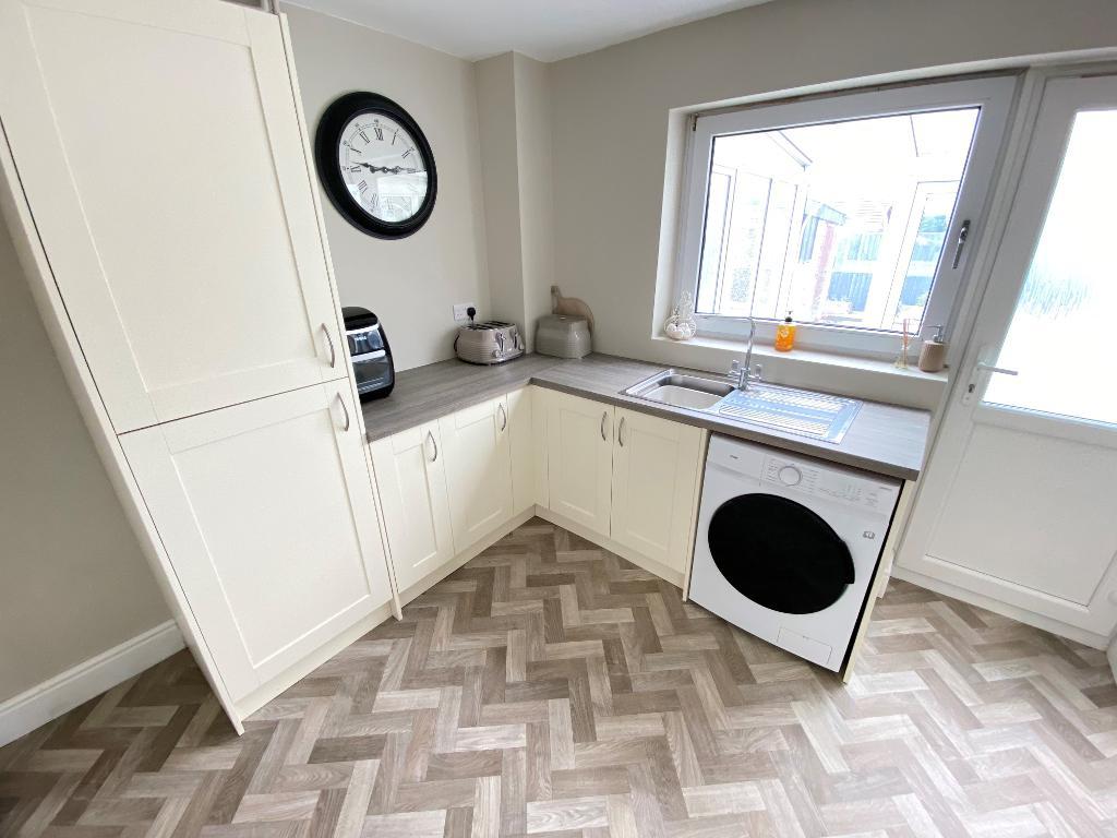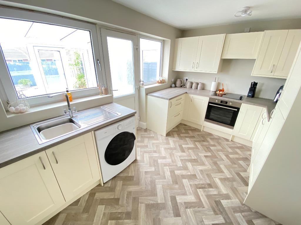 8' 10'' x 14' 5'' (2.7m x 4.4m) Double glazed window to rear elevation. Roll top work surfaces with a sink, drainer and mixer tap. A range of matching wall and base units. Electric oven, hob and extractor fan. Integrated fridge/freezer. Under stairs storage. Vinyl flooring, power points and a wall mounted radiator.