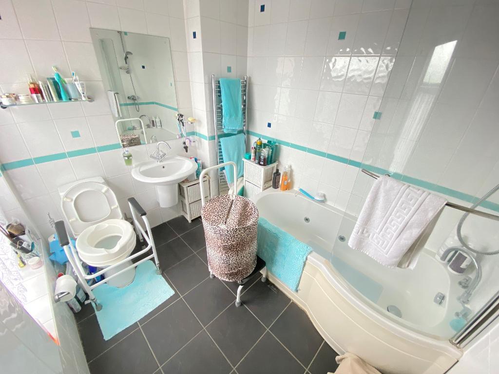 6' 10'' x 8' 2'' (2.1m x 2.5m) Double glazed window to rear elevation. Pedestal wash hand basin with low level w/c. Bath with over head shower. Spot lighting. Fully tiled walls and flooring with a wall mounted radiator.