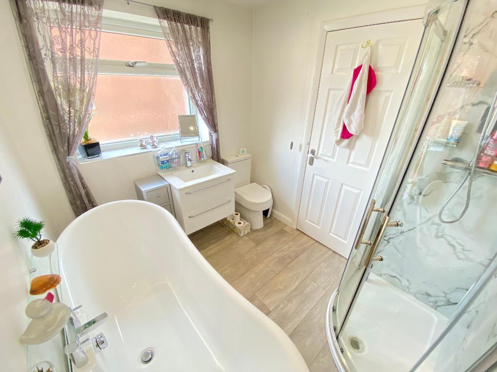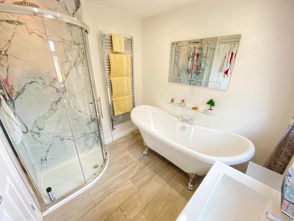 6' 6'' x 7' 6'' (2m x 2.3m) Double glazed frosted window to side elevation. Vanity wash hand basin with low level w/c. Slipper bath and cubical shower. Spot lighting. Tiled flooring and a heated towel rail.