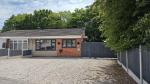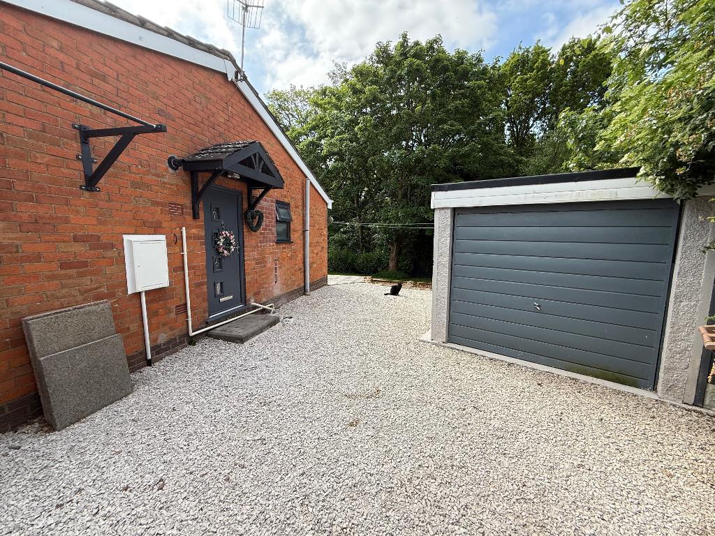 To the front, a gravel driveway and garage with an a up and over door. To the rear, a laid to lawn and Indian stone patio area.