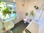 7' 6'' x 6' 6'' (2.3m x 2m) Double glazed frosted window to front elevation. Pedestal wash hand basin with low level w/c. Bath with an overhead shower and fully tiled walls. Tiled flooring and a heated towel rail.
