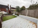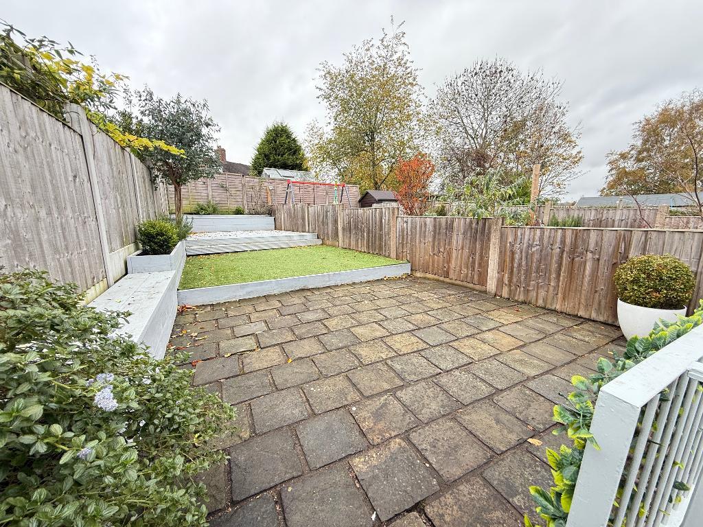 To the front, steps to the front door and paved side entrance. To the rear, a paved patio area, artificial lawn, decked seating area and fenced panelling.