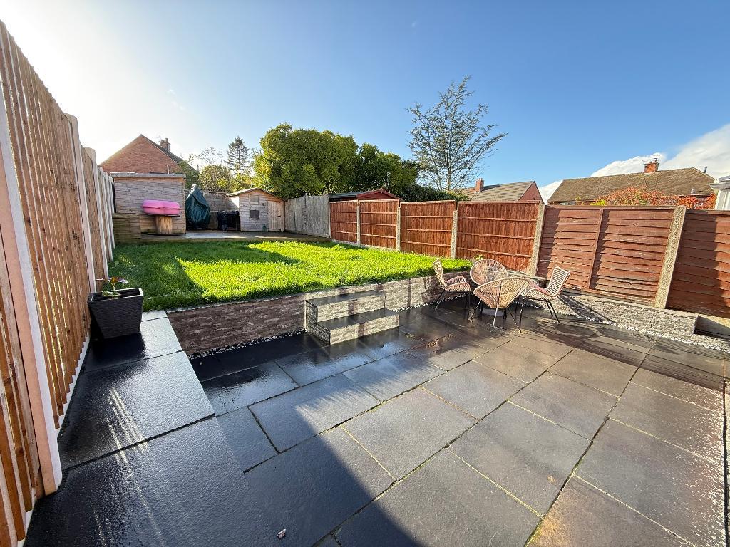 To the front, a block paved driveway. To the rear, a laid to lawn garden, decked patio area, patio space and fenced panelling.