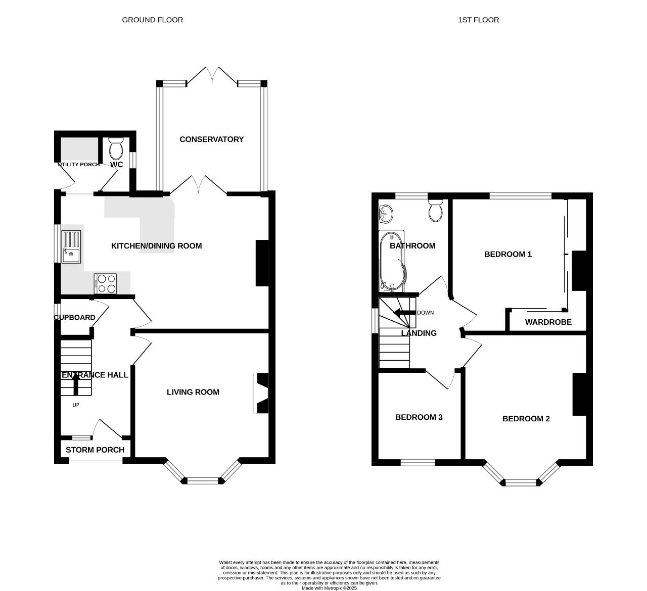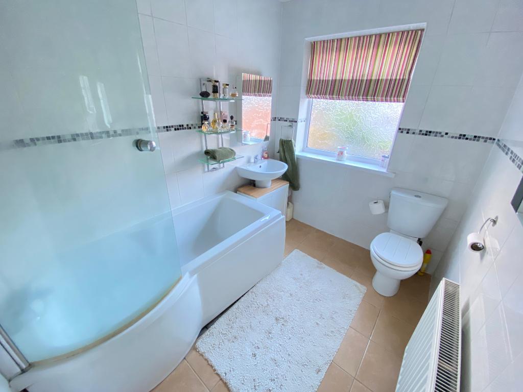 6' 2'' x 8' 2'' (1.9m x 2.5m) Double glazed frosted window to front elevation. Pedestal wash hand basin with low level w/c. Bath with shower to wall. Fully tiled walls. Tiled flooring and a wall mounted radiator.