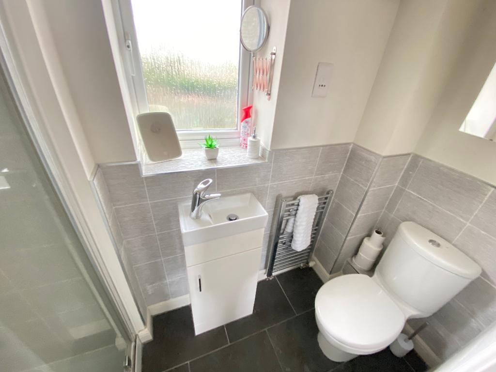Double glazed frosted window to rear elevation. Vanity hand wash basin with low level w/c. Shower cubical. Tiled flooring and a heated towel rail.