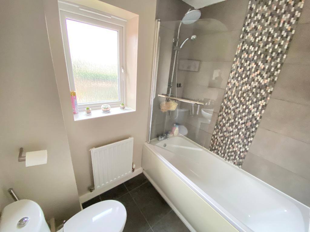 Double glazed frosted window to front elevation. Panelled bathtub with shower overhead and shower screen. Low level WC and wash hand basin. Wall mounted radiator and vinyl flooring