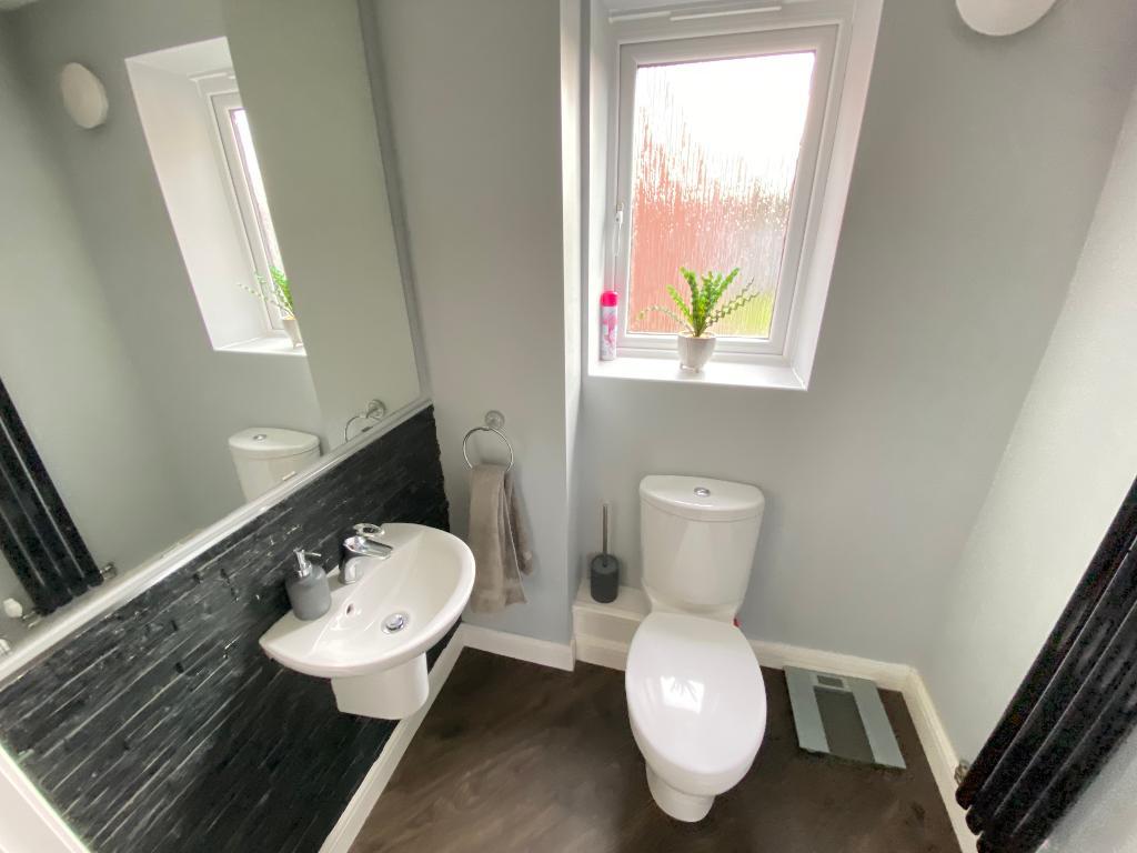Double glazed frosted window to rear elevation. Wall mounted hand wash basin with low level w/c. Laminate flooring and a tall radiator.