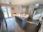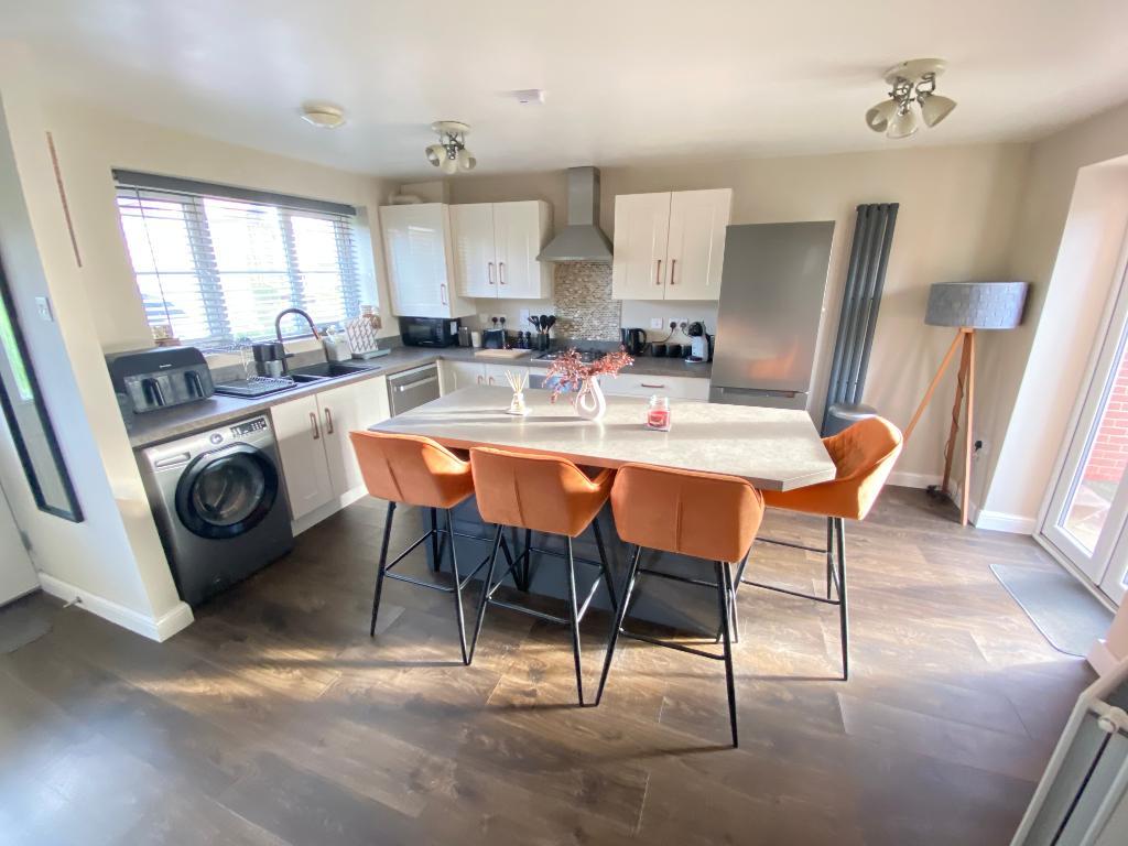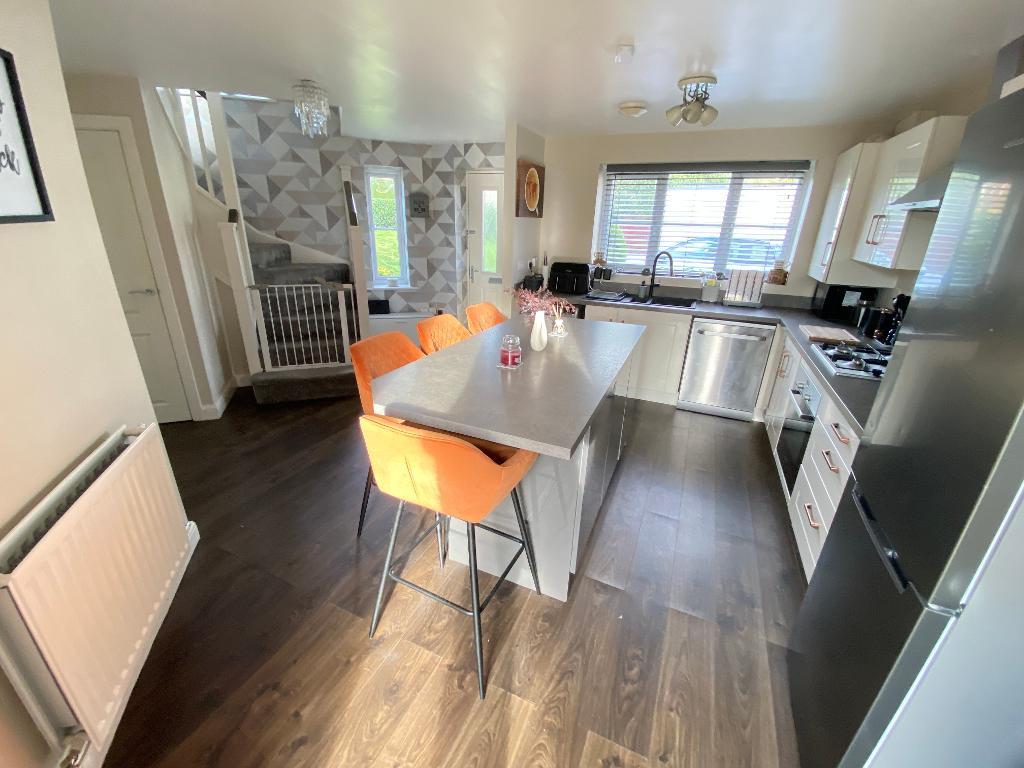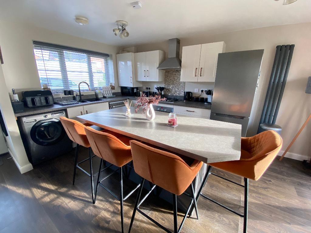 Door to front elevation and two double glazed windows to front elevation. French doors to the rear elevation. Roll top work surfaces with a sink, drainer and mixer tap. A range of matching wall and base units with tiled splash backs. Electric oven and four burner hob with extractor fan. Plumbing for a washing machine. Island. Under stairs storage. Laminate flooring, power points and a wall mounted radiator.