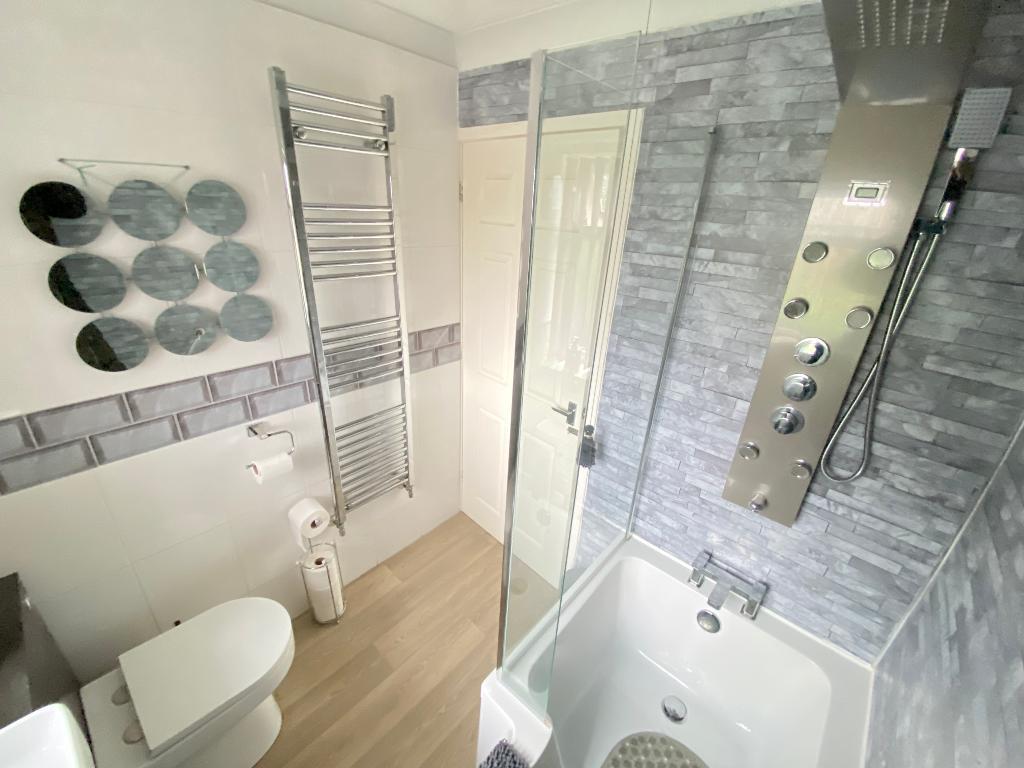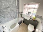 5' 10'' x 5' 10'' (1.8m x 1.8m) Double glazed frosted window to rear elevation. Vanity wash hand basin with storage and low level w/c. Bath with shower. Full tiled walls. Vinyl flooring and a heated towel rail.