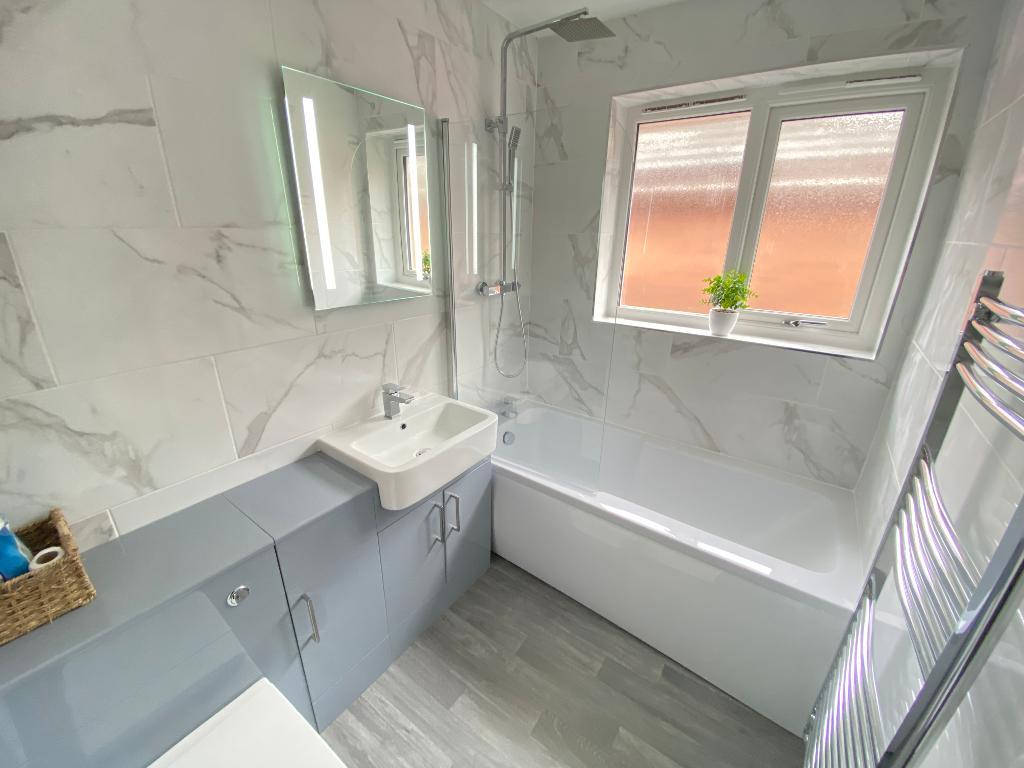 7' 6'' x 5' 2'' (2.3m x 1.6m) Double glazed frosted window to side elevation. Vanity wash hand basin with low level w/c. Panel bath with overhead shower and shower attachment. Laminate flooring and a heated towel rail.