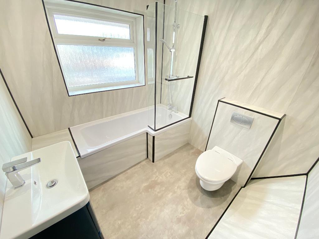 7' 6'' x 6' 6'' (2.3m x 2m) Double glazed window to front elevation. Vanity hand wash basin with low level w/c. Bath with waterfall shower. Plastic cladding. Tiled flooring and a heated towel rail.