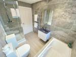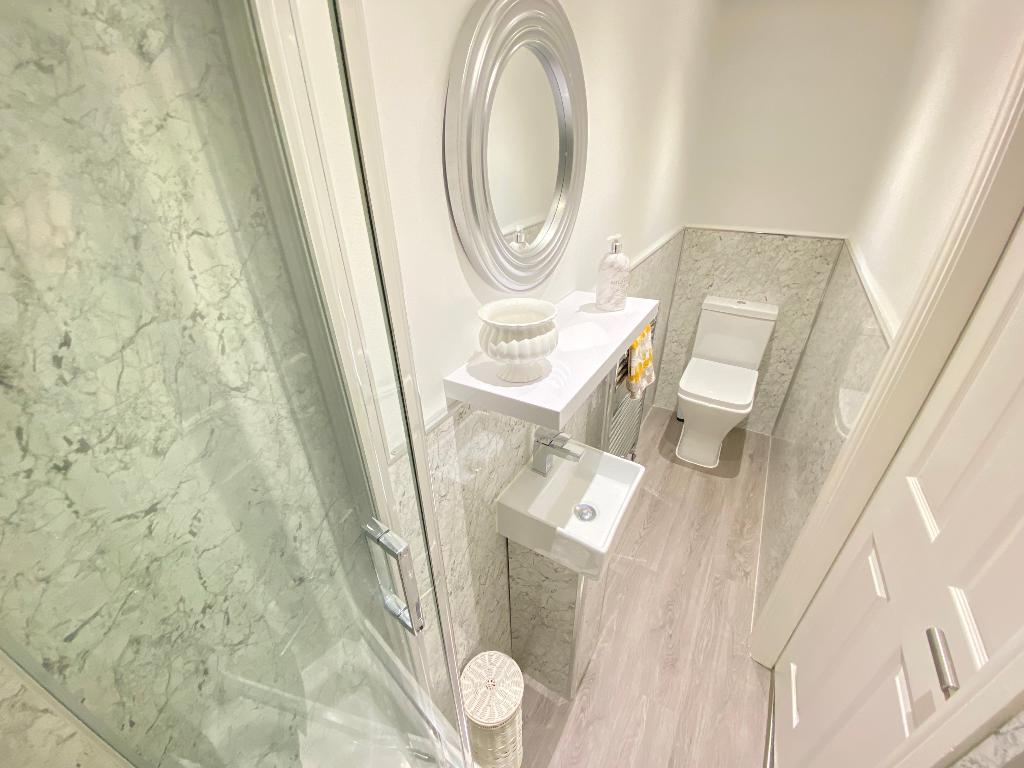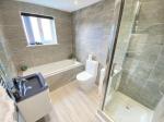 8' 10'' x 5' 10'' (2.7m x 1.8m) Double glazed window to rear elevation. Vanity wash hand basin with store and mixer tap. Bath with mixer taps, shower cubical with waterfall shower and shower attachment. Fully tiled walls. Tiled flooring and a heated towel rail.