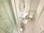 2' 3'' x 9' 10'' (0.7m x 3m) Pedestal wash hand basin with low level w/c. Shower cubicle and extractor fan. Spot lighting. Laminate flooring and a heated towel rail.