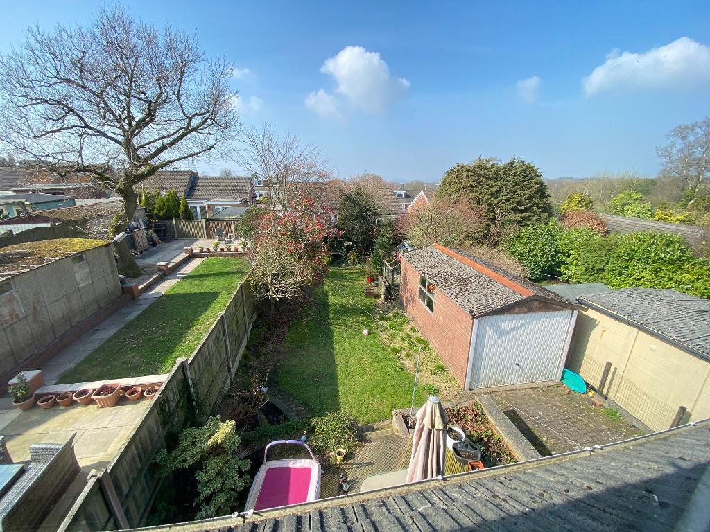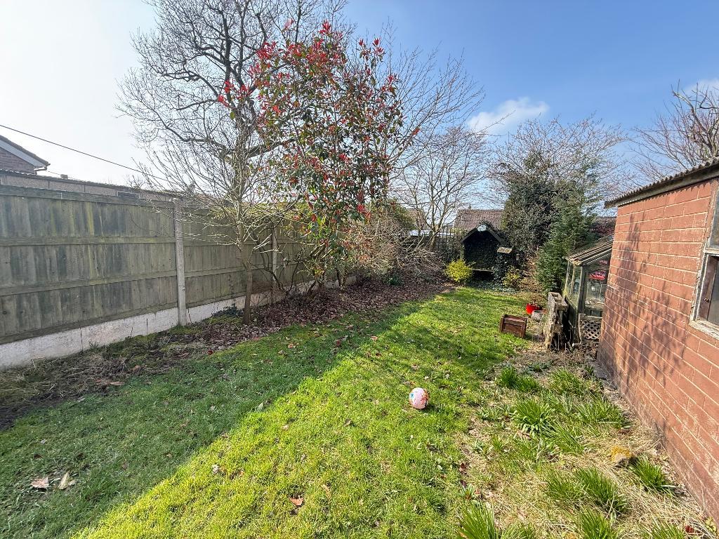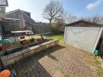 To the front, a driveway and laid to lawn. To the rear, a laid to lawn, detached garage, decked patio area, shrubbed boarders and fence panelling.