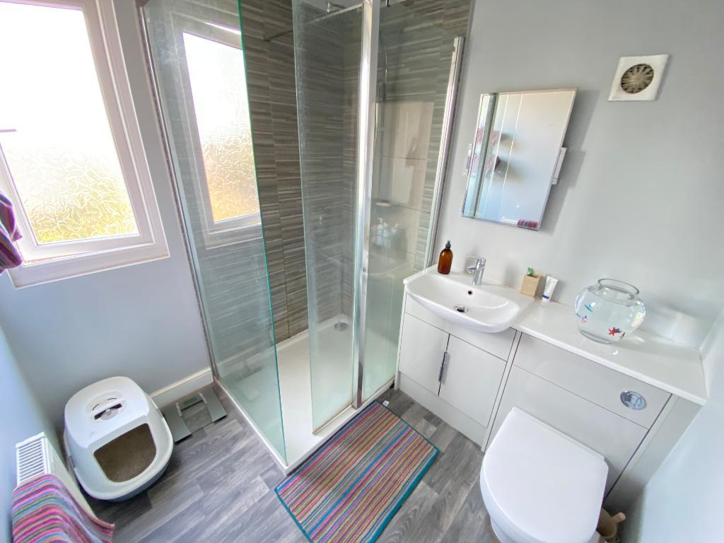 6' 2'' x 6' 10'' (1.9m x 2.1m) Double glazed frosted window to rear elevation. Vanity wash hand basin with low level w/c. Shower cubical with waterfall shower. Spot lighting. Laminate flooring and a wall mounted radiator.